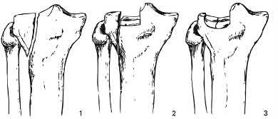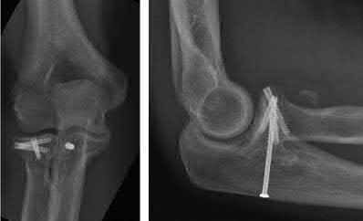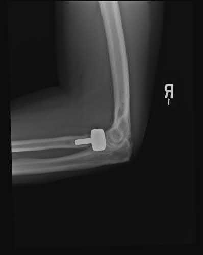 Illustration A shows a intraarticular fracture of the distal humerus in a patient with rheumatoid arthritis, severe osteoporosis, and preexisting arthritic changes who was treated with a total elbow replacement.