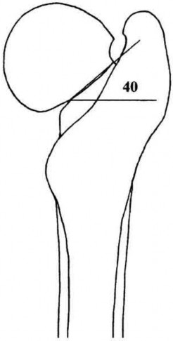 A 27-year-old woman falls off a speedboat and sustains a femoral neck fracture. Following fracture fixation, she develops the condition shown in Figure A. It is determined that the fracture line lies 40° to the horizontal plane as shown in Figure B. The surgeon decides to use a dynamic hip screw for revision. The screw is first placed across the fracture site and lies at 130° to the vertical plane as shown in Figure C. The surgical correction necessary is