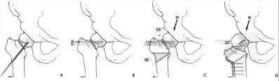 Figure A shows nonunion of a femoral neck fracture after cannulated screws. Figure B shows a fracture line at 40° to the horizontal. Figure C shows DHS screw trajectory 130° to the vertical. Illustration A shows the technique of fixation of a fracture with a 40° angulation to the horizontal with a 20° lateral closing wedge osteotomy and a 150° DHS sideplate (parts A-F). Illustration B shows the same fracture fixed with a fixed angle device (left, blade plate) that went on to union (right, radiograph 7 years later). Illustration C shows correction of the fracture angle from 55° to 20° with a traditional Pauwels 35° valgization osteotomy.