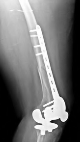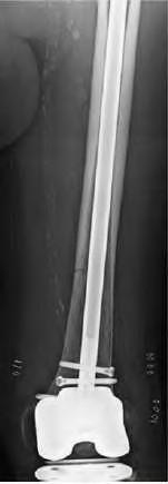 Figure 94 is the radiograph of a patient who underwent component removal, insertion of an antibiotic spacer, and recent completion of 6 weeks of intravenous antibiotic therapy. The patient's C-reactive protein (CRP) and erythrocyte sedimentation rate (ESR) have decreased and are now within defined limits. The skin is supple and the patient has a range of motion between 10 and 70 degrees.