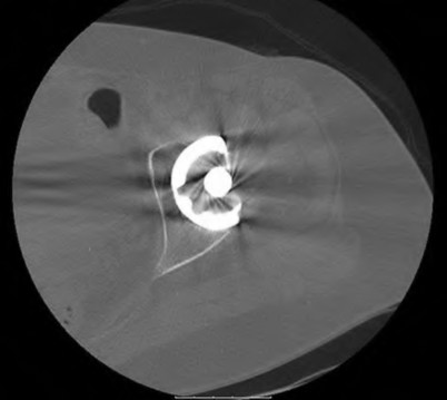 Figures 75a through 75c are the radiographs and CT scan of a 58-year-old woman who underwent cementless left total hip arthroplasty. Nine months after surgery, she continued to have groin pain when she actively flexed her hip. She had trouble walking up stairs and getting out of her car.