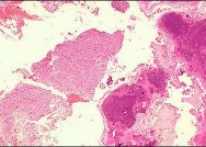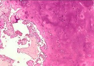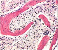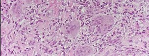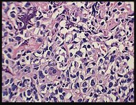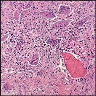 This pathology is most consistent with giant-cell tumor. Note the presence of multinucleated cells and stroma of spindlelike cells with pale staining cytoplasm and nuclei. Giant-cell tumors typically occur in patients ages 20 to 40. Common sites include the epiphysis of the distal femur or proximal tibia (50% of the time). Although it is a benign lesion, giant-cell tumors have a tendency for bone destruction, recurrence, and, rarely, metastasis. The initial treatment of choice is curettage with grafting or cementation. For recurrent or stage III tumors, wide excision may be necessary. Chemotherapy or radiation therapy are not indicated as initial treatment, especially if this is an isolated primary lesion.