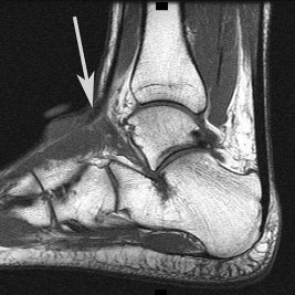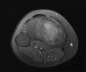 Synovial sarcoma is a soft-tissue sarcoma that usually occurs in young adults. Synovial sarcoma often causes pain, unlike most soft-tissue sarcomas, which generally do not cause pain. Imaging characteristics include soft-tissue calcifications on plain radiographs and a heterogeneous mass that is generally isointense to muscle on T1-weighted images and hyperintense to muscle on T2-weighted images. There are biphasic and monophasic types of synovial sarcoma. The biphasic