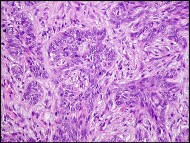 type, which is depicted here, has both spindle cell and epithelial components and will stain for both vimentin and cytokeratin. More than 90% of patients with synovial sarcoma have a characteristic genetic translocation of t(X;18), which results in the fusion protein SS18-SSX. This translocation can be stained for use of florescence in situ hybridization technology. t(11;12) is seen in Ewing sarcoma. T(9;22) is seen in extraskeletal myxoid chondrosarcoma. t(12;16) is seen in myxoid liposarcoma.