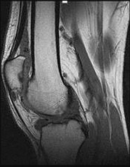 Figures 6a through 6d are the radiographs and T1-weighted sagittal and fat-saturated axial MR images of an otherwise healthy 56-year-old man who has anterior knee pain and intermittent swelling after sustaining a noncontact twisting injury. Low-power and high-power hematoxylin and eosin stained histologic specimens are shown in Figures 6e and 6f. Based on the history, radiographs, CT scan, MR imaging, and histologic findings, what is the most likely diagnosis?