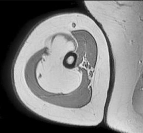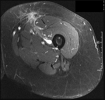 MR imaging reveals a lesion within the vastus intermedius muscle that has signal characteristics consistent with vascular structures and a “bag-of-worms” appearance consistent with a vascular malformation. T1-weighted MR imaging shows fat interspersed among the tissue consistent with a vascular malformation. Vascular malformations often can be determined on imaging alone, particularly if the radiographs reveal phleboliths. Biopsy is generally unnecessary and open biopsy can be particularly difficult due to significant bleeding if performed without the tourniquet, and difficulty identifying the lesion if a tourniquet is utilized. Wide resection generally is unnecessary because these lesions do not have malignant potential. Excision of vascular malformations can be curative, but many patients experience symptom relief with percutaneous sclerotherapy. This patient should be referred for consideration of this less morbid minimally invasive approach.