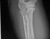 Figure E shows a pediatric medial epicondyle apophyseal avulsion fracture.