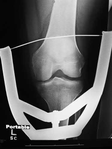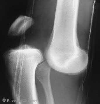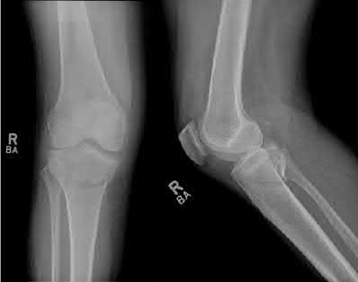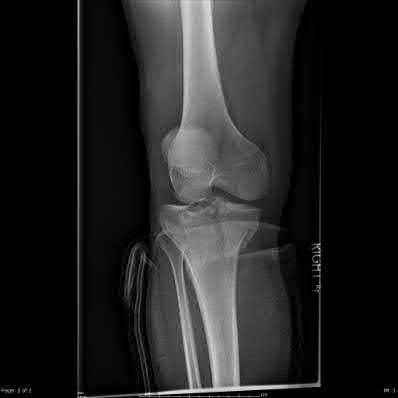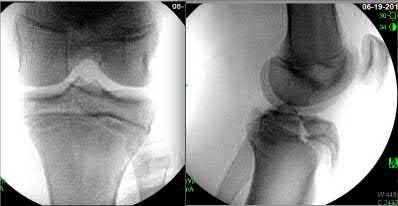 Figures 1 and 2 are the radiographs of a 35-year-old man who is brought into the emergency department after a motor vehicle collision. He is complaining of isolated knee pain. Examination reveals swelling, blood filled blisters, popliteal ecchymosis, joint line pain, and limited knee joint motion. His pulses and sensation are normal.