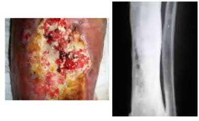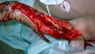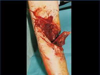1) Presence of an acute open fracture and crush injury