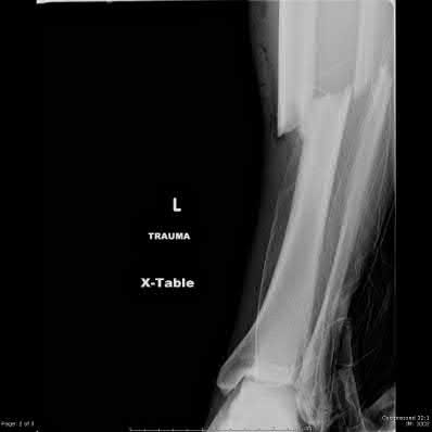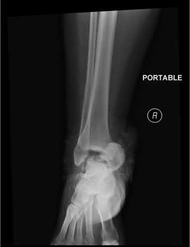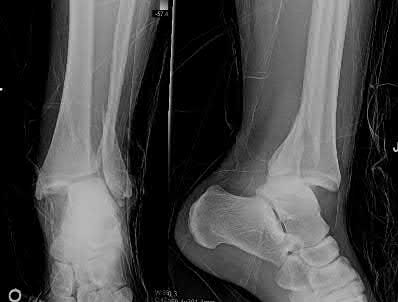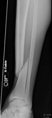 The radiograph demonstrates a Lauge-Hansen supination-adduction fracture-dislocation. There is a transverse fibula fracture and a vertical medial malleolus fracture.