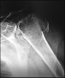The radiograph reveals an atrophic nonunion of the diaphysis of the clavicle. Electrical or ultrasound stimulation may be an option in diaphyseal nonunions that have