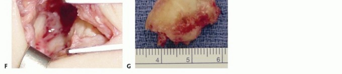 TECH FIG 1 • A. Chronic scaphoid nonunion with SNAC. The patient had no previous treatment. B. An incision is made directly over the FCR tendon. C. The tendon is retracted and its subsheath opened longitudinally. D. The radiocarpal joint is opened longitudinally and the scaphoid is visualized. E,F. The distal pole of the scaphoid is excised with osteotomes and rongeurs. If indicated, a radial styloidectomy can be performed at this point. G. Excised distal pole of the scaphoid.