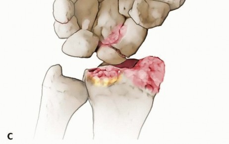 FIG 3 • A. Arthritis observed between the distal pole of the scaphoid and the radial styloid (SNAC grade I).