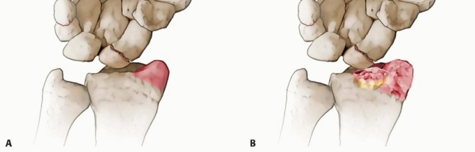 FIG 2 • A. Volar intraosseous blood supply to the scaphoid with laterovolar and distal vessels visualized. B. Dorsal intraosseous blood supply to the scaphoid.Many patients present once pain and decreased range of motion in the wrist has become increasingly severe. In these cases, salvage procedures requiring arthrodesis are often the only options left.