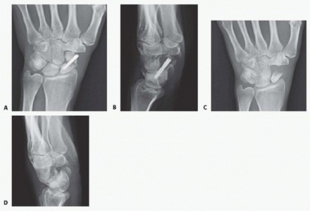 Scaphoid fractures are quite commonplace, representing the most frequently fractured carpal bone with an annual incidence of approximately 29 per 100,000.5 Fractures of the scaphoid, when treated acutelyand appropriately, have union rates greater than 90%.3,9 However, without proper diagnosis and treatment, scaphoid fractures frequently result in nonunion.Initial treatment for a scaphoid nonunion is typically open reduction and internal fixation (ORIF) with bone graft, be it a corticocancellous wedge or a vascularized graft.Despite appropriate internal fixation and bone grafting, failure rates are approximately 15% in waist fractures and 33% in proximal pole fractures.12If ORIF and bone grafting fails, the surgeon is then left with difficult choices.Revision ORIF with bone grafting (failure rate of 50%)2,16Salvage procedure which may have a higher rate of satisfactory resultsSilicone prostheses previously described have had poor results due to silicone synovitis and implant loosening, dislocation, and breakage.13When a patient has pain caused by a chronic scaphoid nonunion (FIG 1) with posttraumatic arthritis limited to the distal pole of the scaphoid and radial styloid, partial scaphoid excision (distal fragment) provides a reasonable, low-morbidity alternative treatment option.4,11,15