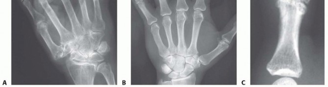 FIG 1 • A. RA affecting hand, with most notable disease affecting MCP joints. The wrist is also affected. B. Isolated osteoarthritis of the MCP joint of the long finger. C. Posttraumatic arthritis affecting the small finger PIP joint. Magnetic resonance imaging (MRI) and computed tomography (CT) are of limited use in the evaluation of the MCP and PIP joints.