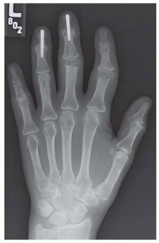 TECH FIG 5 • Postoperative radiograph of patient with diffuse osteoarthritis. Note the silicone implant arthroplasties for the PIP joints of the index and long fingers as well as the fusions of the distal interphalangeal joints of the long and ring fingers. Clinical alignment was excellent.
