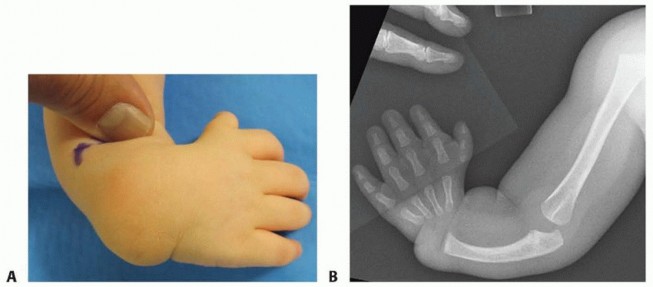FIG 1 • A. Preoperative photo showing radial deviation of the wrist. B. Anteroposterior (AP) radiograph of the same child demonstrating type IV radial deficiency. Because of its frequent association with systemic conditions, all patients require careful examination of their spine and cardiac, renal, and hematologic systems.