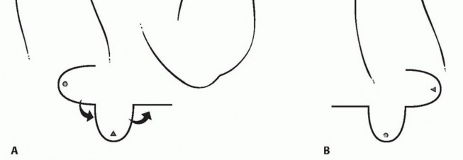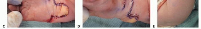 Timing of surgery. Younger patients have the most to gain from soft tissue release with bilobed flap. Our preference is to perform this procedure between 12 months and 2 years of age; however, older patients will also benefit.May be combined with other indicated surgical procedures, including flexor digitorum superficialis (FDS) opponensplastyWe prefer to perform pollicization or thumb reconstructive procedures for associated types IIIB to V thumb hypoplasia in a staged manner.Others have combined centralization procedures with bilobed flaps. Radiographs are performed to confirm clinical findings (see FIG 1B).Clearance of associated comorbidities—appropriate consultation or investigation in particular to exclude cardiacand hematologic abnormalities that may influence safety of anesthesia and surgical complications. Before surgery, the patient must have undergone adequate soft tissue stretching.In the first few months, this is accomplished by splinting. In severe cases, serial casting may be necessary.P.1353After about 6 months of age, active stretching is started by the parents with use of nighttime splinting.External fixator-assisted soft tissue distraction is reserved for the most severe cases and, in our experience, is uncommonly indicated prior to a bilobed flap; it may be beneficial in older children.