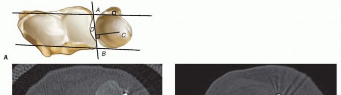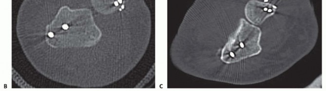 FIG 3 • A. Radioulnar ratio method to measure DRUJ subluxation on a CT scan. See text for details. B. Axial CT scan demonstrating dorsally dislocated ulna following ulnar styloid open reduction internal fixation (ORIF). C. Axial CT scan following reduction and pinning of the dislocated DRUJ. (A: Adapted from Lo IK, MacDermid JC, Bennett JD, et al. The radioulnar ratio: a new method of quantifying DRUJ subluxation. J Hand Surg Am 2001;26:236-243.)