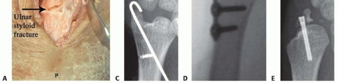 TECH FIG 4 • Ulnar styloid fracture fixation. A. The distal ulna is exposed at the ulnar styloid and a 3.5-mm drill guide is used to reduce the fracture and to pass K-wires. B. Anteroposterior (AP) radiograph of a tension band open reduction internal fixation (ORIF). C. Tension band construct with a suture anchor. D. ORIF with plate and screw construct. E. Loss of fixation using headless compression screw. A transverse (dorsal to volar) 2-mm drill hold is made proximally through the ulnar neck, and a 27-gauge wire is placed through the TFCC at its insertion on the ulnar styloid.A figure-of-eight bend is made, and one limb is passed volar to dorsal through the transverse bone hole, whereas the other is passed dorsal to volar.The wire is then twisted to tension, and the pins are bent and cut. The bent tips are pointed radially and driven into the styloid with a small bone tamp, capturing the wire ( TECH FIG 4B).Alternatively, after placing the pins through the ulnar styloid, a 2-0 suture anchor can be placed in the ulnar neck and the sutures passed in opposite directions around the styloid. The limbs are tied down to the medial ulnar shaft, and the pins are bent and cut as previously discussed ( TECH FIG 4C).Plate and screw construct may also be used for buttress effect, but implant prominence must be considered ( TECH FIG 4D).Headless compression screw fixation is advocated by some. We have noted frequent failure and malreduction with this technique. If screw fixation is used, bicortical fixation is recommended ( TECH FIG 4E).If the DRUJ is still unstable, proceed with radioulnar transfixation pinning. Wound closure, sterile dressings, and long posterior splint are applied.P.250PEARLS AND PITFALLS
