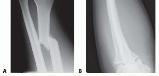 Fracture of the radial shaft with an associated distal radioulnar joint (DRUJ) dislocation ( FIG 1A,B)It is well established that anatomic stabilization of the radial shaft fracture typically results in a stable DRUJ that can be treated nonoperatively with a period of immobilization.When the DRUJ is either irreducible or unstable, following anatomic reduction and compression plating of the radius fracture, operative stabilization of the DRUJ is required.Pediatric injury is not discussed in this chapter.