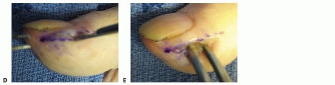 TECH FIG 1 • A. Incision to drain the paronychia. B,C. Incision and removal of a portion of the nail plate. D,E. Alternative incision to drain the paronychia. If the abscess extends to the eponychium, the incision may be carried as far proximally as necessary; a portion of nail may then be removed if necessary.Avoid making an incision across the eponychium, as this may result in a late nail fold deformity.