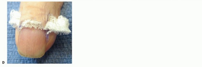 TECH FIG 2 • Incision (A) and elevation of the eponychial fold (B,C) with removal of the proximal nail to decompress a proximal abscess. D. The wound is packed with gauze to prevent premature closure.