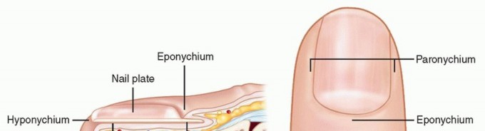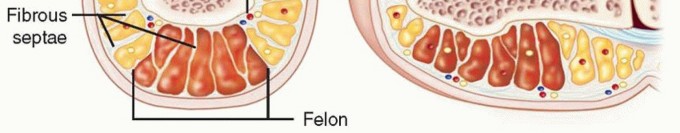 Acute paronychia results from the introduction of bacteria into the space between the nail fold and the nail plate, either proximally or laterally.This commonly occurs as a result of a hangnail, nail biting, artificial nails, or an overzealous manicure.Chronic paronychia results from colonization and infection by organisms that enter the space between the nail plate and the cuticle, eponychium, and nail fold.Infection may result from repeated exposure to moisture.This chronic infection and inflammation lead to fibrosis of the eponychium, which, in turn, leads to decreased vascularity of the dorsal nail fold.This decreased vascularity predisposes to repeated bacterial insults, resulting in the characteristic clinical exacerbations.Felons often result from penetrating trauma or from bacterial inoculation through the exocrine sweat glands contained within the pulp.Cellulitis and local inflammation lead to local ischemia, which, in the setting of the closed spaces defined by septa, leads to increased pressure.Fat necrosis and abscess formation result from the increased pressure, which, in turn, causes a further increase in pressure and, in effect, a compartment syndrome.