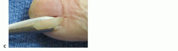 TECH FIG 3 • A,B. Incision for marsupialization of chronic paronychia. C. Tissue removed with the underlying germinal matrix exposed.