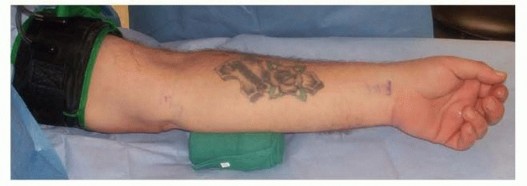 FIG 5 • The arm is draped, the sterile tourniquet is placed proximally, and a bump under the elbow assists visualization. Alternatively, a proximal tourniquet may be placed before the arm is draped. P.844 Table 1 Techniques for Cubital Tunnel Release Technique|Advantages|Disadvantages|Contraindications|Indications---------In situ release Simplestdissection Does not devascularize the nerve with circumferential dissection Early mobilizationKeeps nerve in same tissue bedDoes not address subluxation of the nerveSubluxating ulnar nerveAbnormal elbow anatomyDiabetic patient Frail patient Patient with focalcompression distal to medial epicondyleEndoscopic releaseSmall incision Early mobilization Shortened recovery timeKeeps nerve in same tissue bedPotential iatrogenic nerve compressionAbnormal elbow anatomy Revision surgeryIn situ release with medial condylectomyPreserves vascular supply to the nerve Early mobilizationKeeps nerve in same tissue bedRisk of destabilizing the medial elbow by damaging the medial collateral ligament of the elbowTenderness at operative siteAbnormal elbow anatomyNot for throwing athletesPatients with mild to moderate symptomsAnterior subcutaneous transferPlaces the nerve in a fresh tissue bedNerve is superficial and may be more susceptible to trauma.Very thin patient Patient with a poor ulnar nerve bedGreater dissectionMore prolonged immobilizationPossible creation of new point of compressionfrom tumor,osteophyte, heterotopic bone Throwing athleteAnteriorintermuscular transpositionTension withelbow range of motion is minimized.Nerve is in fresh tissue bed.Greater dissectionNeed for longer immobilizationDiabetic patientPatient witha poor ulnar nerve bed from tumor, osteophyte, heterotopic boneAnteriorsubmuscular transpositionTension withelbow range of motion is minimized.Nerve is well padded.Greater dissectionNeed for longer immobilizationThin patientRepeat cubital tunnel release Patients with severe compression