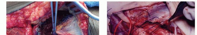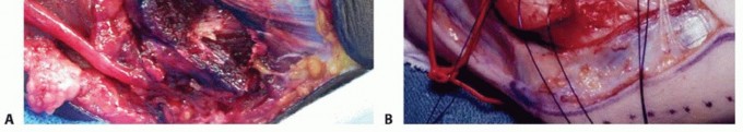 TECH FIG 6 • Submuscular transposition. The flexor pronator mass is incised (A), and the nerve is passed deep to the flexor pronator muscle mass (B). Sutures are in place to repair the muscle origin following use of a simple straight incision. (A: Copyright Amy Ladd, MD; B: Courtesy of Thomas R. Hunt, III, MD.) The median nerve and brachial artery lie in this plane. Transpose the ulnar nerve in the medial position (TECH FIG 6B).Take care to avoid injury to the medial collateral ligament complex.Flex the elbow and repair the flexor pronator mass with 3-0 Ethibond suture.Place a drain.The arm is immobilized with a pronated forearm in an elbow splint for 2 to 3 weeks at 45 to 60 degrees of flexion with progressive protected mobilization.P.848