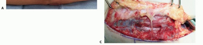 TECH FIG 5 • Intramuscular transposition. The nerve is placed in a tunnel in the muscle, and the fascia is closed. (Courtesy of William Kleinman, Indiana Hand Center.)
