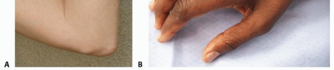 FIG 3 • A. “Perched” ulnar nerve. The nerve subluxates anteriorly, sitting on top of the medial epicondyle with the elbow in flexion. B. Wasting of first dorsal interosseous nerve. (A: Copyright Amy Ladd, MD.) Elbow flexion increases pressure on the nerve and decreases the volume of the cubital tunnel, resulting in compression of the nerve.7