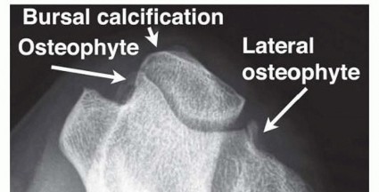 FIG 4 • Axial view of the elbow demonstrates a hooked osteophyte within the cubital tunnel as well as calcification in the bursa and osteophyte. (Copyright Amy Ladd, MD.)