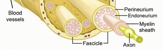 Peripheral nerves consist of axons surrounded by a nerve sheath (FIG 1).The epineurium is a thin outer layer of connective tissue containing blood vessels that supply the nerve. Perineural cells form a strong cellular layer, the perineurium, surrounding each fascicle (bundle) of axons. An endoneurial layer of protective Schwann cells surrounds each individual axon.