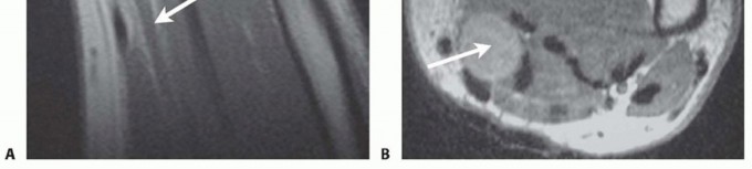 FIG 3 • A. Cross-sectional imaging of a BPNST reveals the mass to be contiguous with normal axons proximally. B.MRI of a benign nerve sheath tumor (arrow) often demonstrates a high fat content, seen best on T1-weighted images.