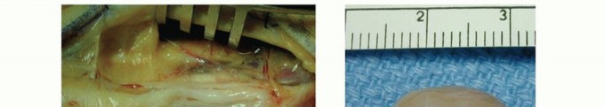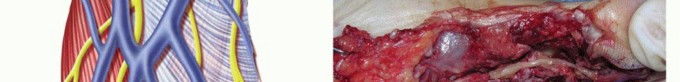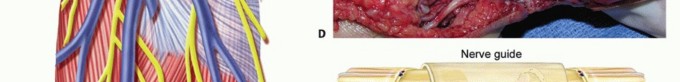 TECH FIG 2 • A. Fascicles are intertwined with tumor cells in a neurofibroma; tumor resection often requires excising a segment of nerve. B. A neurofibroma of the posterior interosseous nerve (PIN). This tumor was inseparable from normal nerve fascicles and excision resulted in permanent loss of finger extension. C. Branches of the MABC run with the basilic vein. The anterior branch is a good match for a digital nerve and can be harvested near the elbow. D. The ulnar digital nerve of the thumb has been grafted with the MABC in this patient, with prior nerve tumor resection and iatrogenic soft tissue loss. E. Nerve conduits provide an environment for nerve regeneration and have been shown to be as good as or better than nerve grafts in many situations. F. A digital neurofibroma was resected and a nerve conduit placed to bridge the intercalary defect. The soft tissues were slow to heal due to motion about the conduit at the metacarpophalangeal joint. Newer, less rigid collagen nerve guides may be better suited for use around the finger joints; however, human trials are lacking.