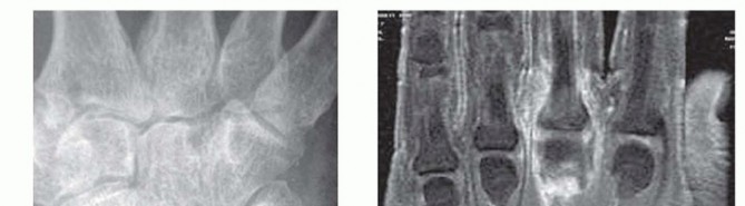 FIG 2 • A. Radiograph showing chondrocalcinosis of the triangular fibrocartilage complex from chronic pseudogout. B. Coronal T2-weighted MRI of an MP joint with underlying septic arthritis. Note the normal bone signal but the presence of high signal within the joint from the fluid and surrounding soft tissue inflammation. A low WBC count with a high percentage of neutrophils (>90%) may indicate an early septic arthritis.11 A joint glucose of 40 mg/dL or less compared with the fasting blood glucose level also suggests a septic process.7Crystal analysis is necessary to rule out the presence of gout or pseudogout because they also can present similarly, including an elevated WBC count in the aspirate.The role of imaging studies early in the course of the septic process is limited. Radiographs may reveal joint distention, presence of foreign bodies, osteomyelitis, air in the soft tissues, and chondrocalcinosis (characteristic of both gout and pseudogout) (FIG 2A). Later radiographs may reveal joint destruction.Magnetic resonance imaging (MRI) is effective in diagnosing early septic arthritis and in differentiating it from osteomyelitis or overlying tenosynovitis (FIG 2B).