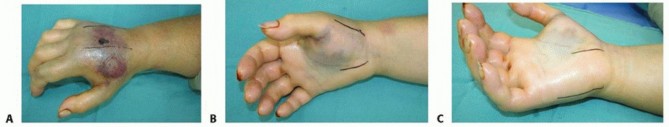TECH FIG 3 • A. Dorsal fasciotomy release. B. Thenar muscle release and carpal tunnel release. C.
