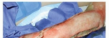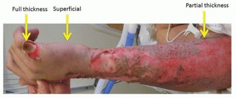 FIG 2 • Upper extremity burn injury demonstrating superficial, partial-thickness, and full-thickness burns.