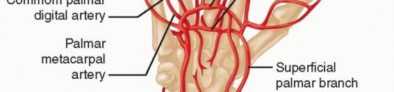 FIG 1 • Vascular anatomy of the hand. P.1149Vasospastic disorders may result from increased sympathetic tone.Vaso-occlusive disorders result in ischemia distal to the site of occlusion.