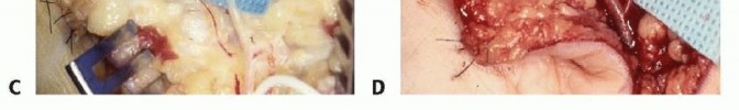 TECH FIG 1 •(continued)C,D. Radical or extensive digital sympathectomy before (C) and after (D) stripping the adventitia from the distal ulnar artery, superficial palmar arch, and common digital arteries to the index-middle, middle-ring, and ring-small finger web spaces.