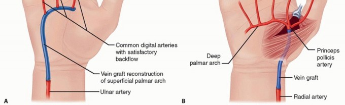 TECH FIG 2 • A. Microsurgical revascularization for thrombosis or occlusive disease of the distal ulnar artery and superficial palmar arch, using an interposition vein graft from the ulnar artery to the common digital arteries. B. Microvascular revascularization for thrombosis or occlusive disease of the distal radial artery and deep palmar arch, using an interposition vein graft from the radial artery to the princeps pollicis artery.