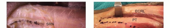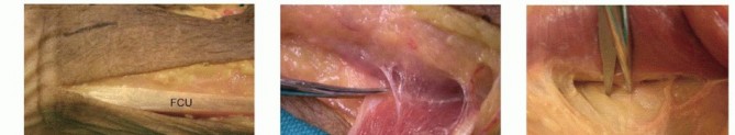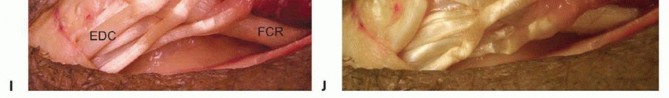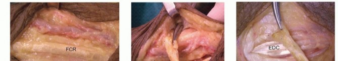 Three general exposures are used:P.895Radial incision with volar exposure for FCR and PT and dorsal exposure for the ECRB and ECRL Distal dorsal incision for EDC exposureIndividual approaches for harvest of the FCU, FCR, and FDSThe ideal tendon transfer tension is based on the individual muscle properties. In general, the optimal tension is established at the peak of the length-tension curve for the donor muscle while the wrist and fingers are maintained in the ideal position. Because this donor muscle position is difficult to determine intraoperatively without specialized equipment, this point reasonably corresponds to the midpoint of the passive muscle excursion. The ideal joint position for each transfer is discussed with the individual transfers.