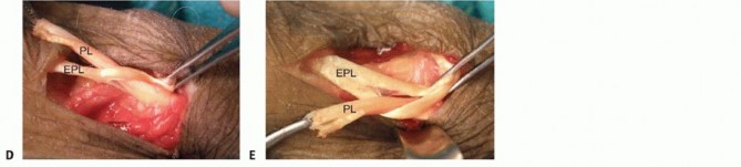 Digitorum Superficialis to Extensor Indicis Proprius/Extensor Pollicis Longus; Ring Finger Flexor Digitorum Superficialis to Long, Ring, and Small Extensor Digitorum Communis; and Palmaris Longus to Abductor Pollicis Longus6,10**** Perform oblique palmar incisions to harvest the FDS of the long and ring fingers.Include both slips for transfer.Suture the remaining distal tendon to the volar plate or soft tissue to prevent proximal interphalangeal hyperextension.Use the volar incision to retrieve the FDS tendons and to harvest the PL.Precisely expose the IOM and make preparations for tendon transfer as discussed in the preceding section.Perform a dorsal incision and EDC exposure similar to that detailed in the preceding section. Transfer the two FDS tendons dorsally through the IOM.The long finger FDS is transferred to the EIP and the EPL. The ring finger FDS is transferred to the long, ring, and small EDC tendons.Set tension at the wrist at 30 degrees and at the MP joint at full extension. Secure the transfer with 3-0 or 4-0 suture.The PL is harvested as detailed for the EPL transfer.The radial subcutaneous route also is used to transfer the PL to the abductor pollicis longus (APL), proximal to the retinaculum.The location of this transfer is slightly more proximal to the PL than the EPL transfer due to the length available for the APL.Set tension in near-full thumb abduction at wrist 30 degrees; secure with 3-0 or 4-0 suture.5. Finger Extension and Thumb Abduction through Flexor Carpi Ulnaris to Extensor Digitorum Communis and Extensor Pollicis Longus and Palmaris Longus to Abductor Pollicis LongusAlthough one donor muscle is not typically transferred to two recipients,3 an FCU transfer to the EPL and EDC has been described. This may be combined with a wrist extension transfer.The technique is similar to that discussed for the FCU to EDC transfer along the ulnar subcutaneous route. The tension is such that the thumb and index metacarpal are parallel.PEARLS AND PITFALLS