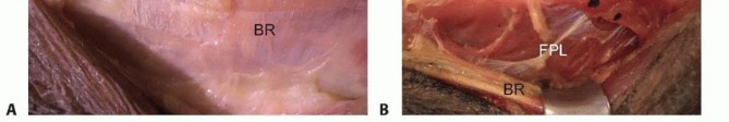 FIG 1 • A. Muscles of the forearm. B. Course of the radial nerve. The motor point for each nerve is fairly consistently located just proximal to the myotendinous junction. In most cases, there is one larger motor branch from the radial nerve or PIN to each muscle.The sequence of muscle innervation is an important distinction when considering the anatomy of the radial nerve. Whereas some nerves distribute their nerve branches in a tree-like fashion, the radial nerve innervates the extensor musculature in an orderly pattern, from proximal to distal. The proper radial nerve supplies the BR, the ECRL, and occasionally the ECRB.P.894The PIN innervates the ECRB, the extensor digitorum communis (EDC), the extensor carpi ulnaris (ECU), the extensor indicis proprius (EIP), and the extensor pollicis longus (EPL).The order of innervation is important in differentiating a radial nerve injury from a mechanical myotendinous injury or muscle disruption after a forearm laceration.Understanding the innervation also is helpful while observing and assessing the clinical recovery after radial nerve injury or repair.