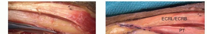 TECH FIG 1 •(continued)E,F. The PT is then woven through the ECRL and ECRB tendons.