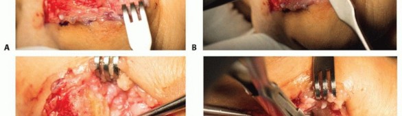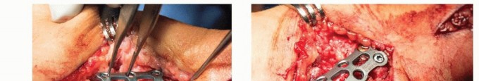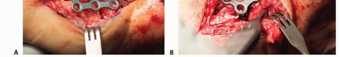 Distal radius autograft is harvested to pack into the arthrodesis site.Extend the dorsal incision proximal to Lister tubercle and bluntly spread through the subcutaneous tissues to expose the extensor retinaculum.Incise the retinaculum sharply over the radial edge of Lister tubercle to expose the tubercle's surface within the second extensor compartment.P.1064Use a curette as a hand drill (spin with compressive force applied by hand) into the radial border of Lister tubercle. This provides access to the medullary canal through an area of thin cortex. Cancellous bone graft is harvested.