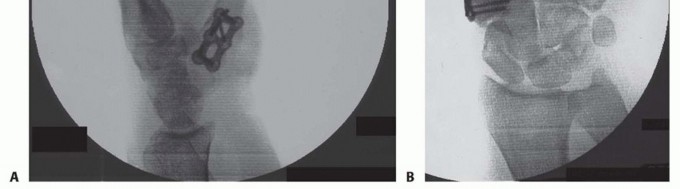 FIG 2 • A,B. AP (A) and lateral (B) fluoroscopic images demonstrating application of plate and screws across thumb CMC joint.